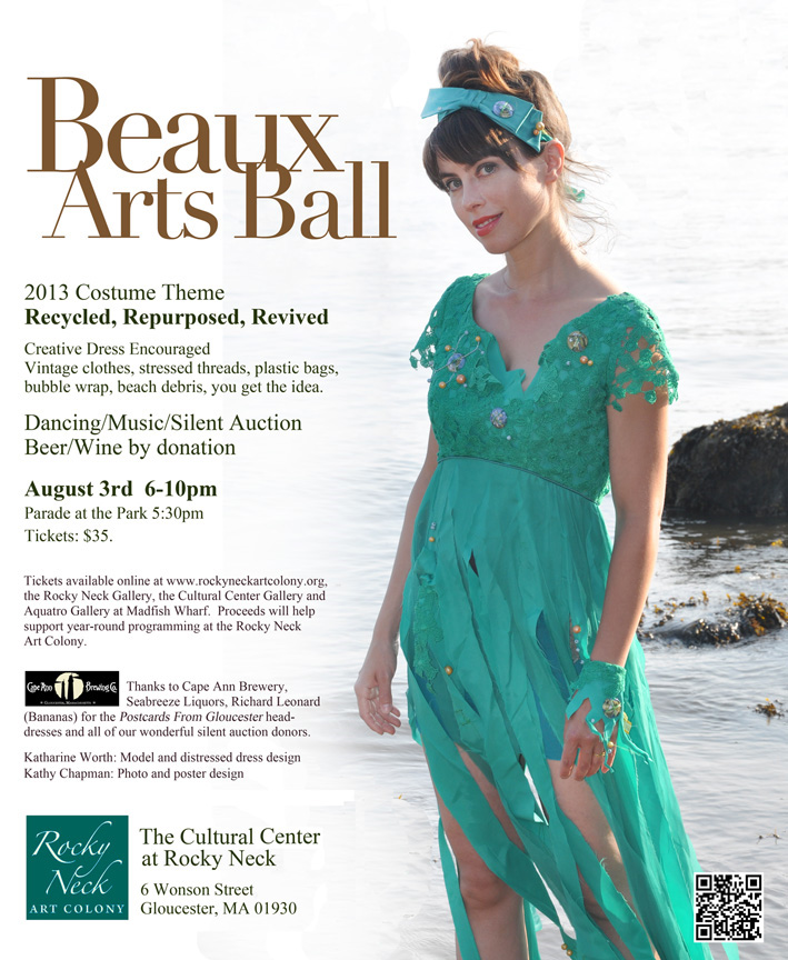 It is coming up fast, the 2013 Rocky Neck Beaux Arts Ball. This year the theme is recycled, repurposed, revived. Put on your creative thinking cap and come up with a fun, unique costume (plastic bags, newspapers, empty cans or bottles, fish net, a recreated second hand outfit – like our poster model Katharine Worth created and is wearing – from Bananas, Second Glance, Madcap Style or any of our many vintage, second hand and thrift shops, etc.). Have fun with your costume, and then come and have fun at the Beaux Arts Ball at the Rocky Neck Cultural Center on Saturday, August 3rd from 6-10:00 pm.
