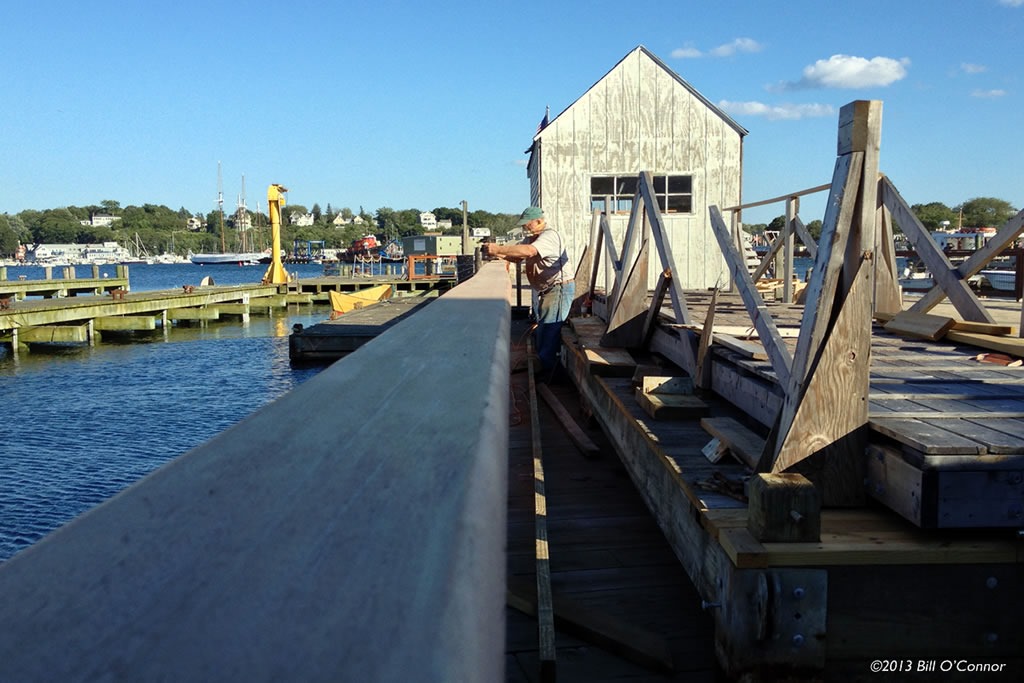 On our last visit to Maritime Gloucester, there was lots of activity going on. The Building Center had a crew installing a new specimen on cabinet in the lab building (made of recycled pieces fromtheir old kitchen display), and Jay McLauchlin was rounding the edges of the new handrails on the wharf with a router.  The whole place is going to look awesome for the Schooner Festival this year!