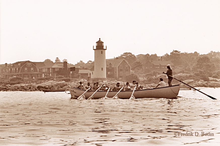 This may have been the Seine Boat with hibachi and keg.. Notice there are two extra passengers. The one in the bow is the bartender, and the one in front of the cox is the grill chef. Rowing is always a good time. If you’d like to row, visit Home page: MaritimeGloucester: Oceans of Discovery, Gloucester, MA