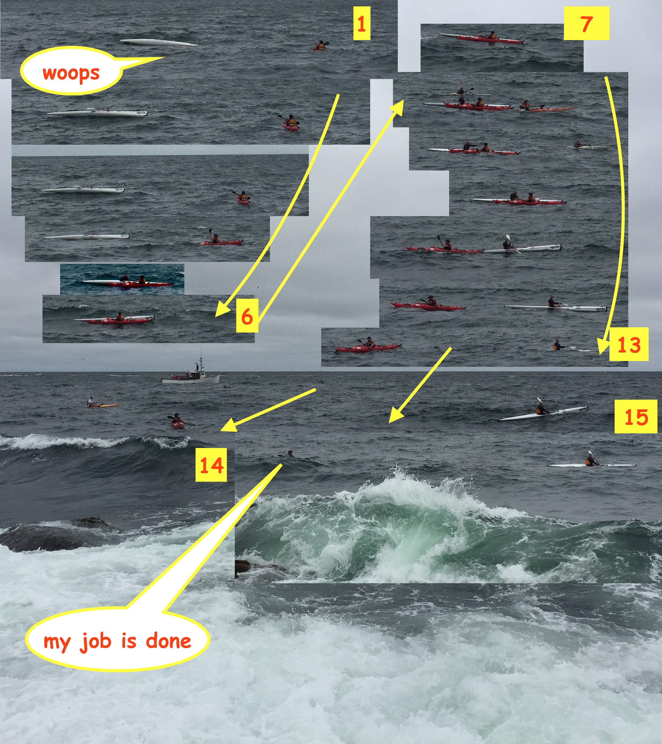 Here a white Epic Surfski flips right at my feet at Andrews Point. My little iPhone 6 does not really capture the drama as the dude in the red sea kayak hears the splash and turns around. (1-2) By 5 he has pulled up even, steadies the Epic as Epic paddler thanks him for stopping and hops back up into the seat. In 8-9 fellow travelers stop by to see if they can offer assistance but red kayak has it well in hand.