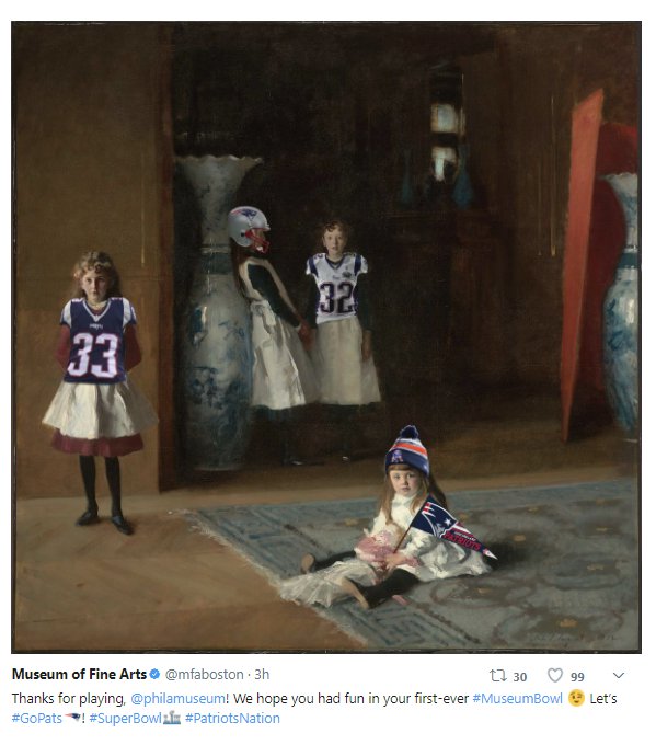 Over the past few years, museums join in the Super Bowl spirit via trash talk on social media accounts. From humorous challenges and clever collection puns it’s morphed into big stake art bets for Super Bowl contenders: Some wins have triggered a museum loan from the losing city’s rival fine arts institution. Yesterday (see below) the Museum of Fine Arts, Boston, announced a twitter showdown with the J Paul Getty Museum, Los Angeles. Look for #MuseumBowl and @mfaboston and @GettyMuseum. It’s going down at 3pm TODAY, Friday, Feb 1, 2019. I don’t know if there’s a wager but I hope so! It’s great fun no matter what.