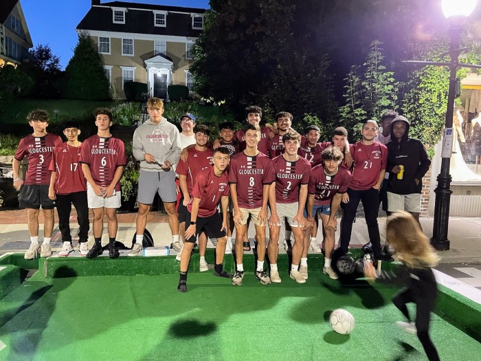 Gloucester’s Main St. Block Party traditions: Soccer boosters had a table and the mini turf for future soccer players to kick and play.