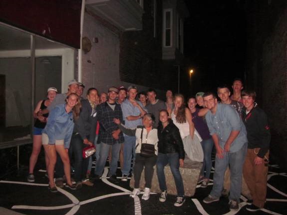 During two Trails and Sails weekends and the last Block Party, the Committee for the Arts (CFTA ) was pleased to participate and spread awareness about municipal art. One event: during the block party we were at Main and Parsons, near a very busy Markouk booth (always busy at Cape Ann Farmers Market, too), fried dough and candy truck (not just kids buying!), Dress Code’s charmingly illuminated booth, and Joe Ciolino’s. What a gorgeous night! We spoke with dozens of folks including the group of twenty youth from Ocean Classroom en route from Maine to Puerto Rico with a stop in Gloucester and a night out downtown. Parsons Street public art mural by James Owen Calderwood.