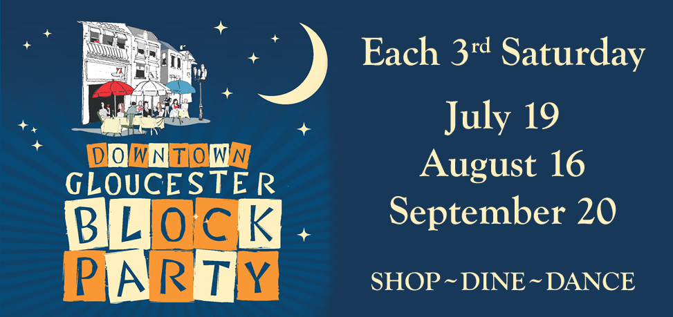 The Downtown Gloucester Block Parties will be held July 19, August 16 and September 20 beginning at 6 pm. Main Street will be transformed into an entertainment mall with live performances on five stages, al fresco dining offered by Main Street restaurants, stores open for shopping until 11 pm plus a vendor area and Kids’ Town to keep the youngsters amused. This is the seventh year Gloucester businesses have been promoted by the successful parties. The Block Parties are free events with a variety of entertainment.