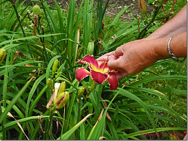 Bobbie demonstrates how hybrids are made. What she likes about this daylily is it’s teeth, or jagged edges.