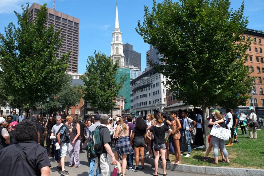 Along Beacon Street, which was closed to traffic, there seemed to be a police headquarters of sort. This was also where the largest group of counter protesters had gathered. They had a megaphone and were leading the crowd in chants — βBlack Lives Matter,β βNo Trump, No KKK, No Fascist USA, and βWhose streets? Our streets.β In repeated situations of high tension and raw emotions, the police kept their cool, handling haters and troublemakers with clarity of strategy and with lightning speed.