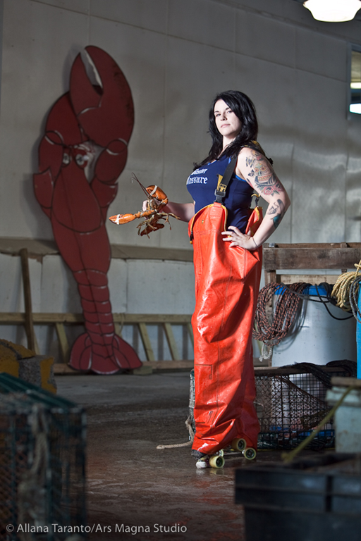 We’ve covered The Boston Derby Dames for the past two years first finding out about it through Krush Puppy, a local who kills it on the flat track! Once I went to my first bout I was hooked. So when Krush asked if they could shoot the 2011 calendar down at the dock I told her I think it would be a perfect fit. The team’s image is tough and blue collar and the mascot is Pinchy McMasshole a giant foam lobster- what place would be better than right here at Captain Joe and Sons!