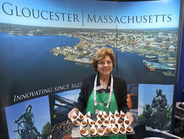 The City of Gloucester is represented at the Boston Seafood Show, a trade only event that runs through Tuesday at the World Trade Center. Here Rosalee Nicastro is handing out bite size fresh cakes where the main ingredient is hake right off the boat. The recipe is from the Gloucester Fisherman’s Wives Association. This exhibition features more than a thousand booths with seafood from all over the world and this product is a standout.