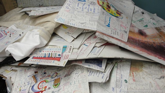 photos of Jon’s art piled up in his old Birdseye work space-