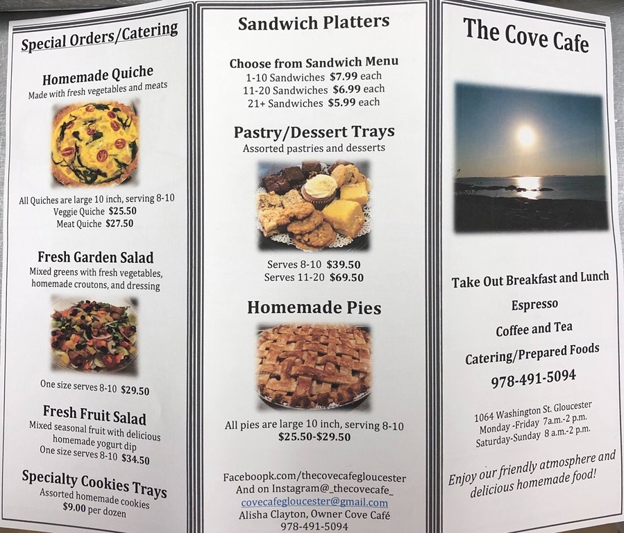 CAPE ANN COFFEES TAKE OUT IS OPEN FOR HOT FRESH COFFEE, BREAKFAST SANDWICHES, SOUP, QUICHE, HOME BAKED TREATS, AND MORE!