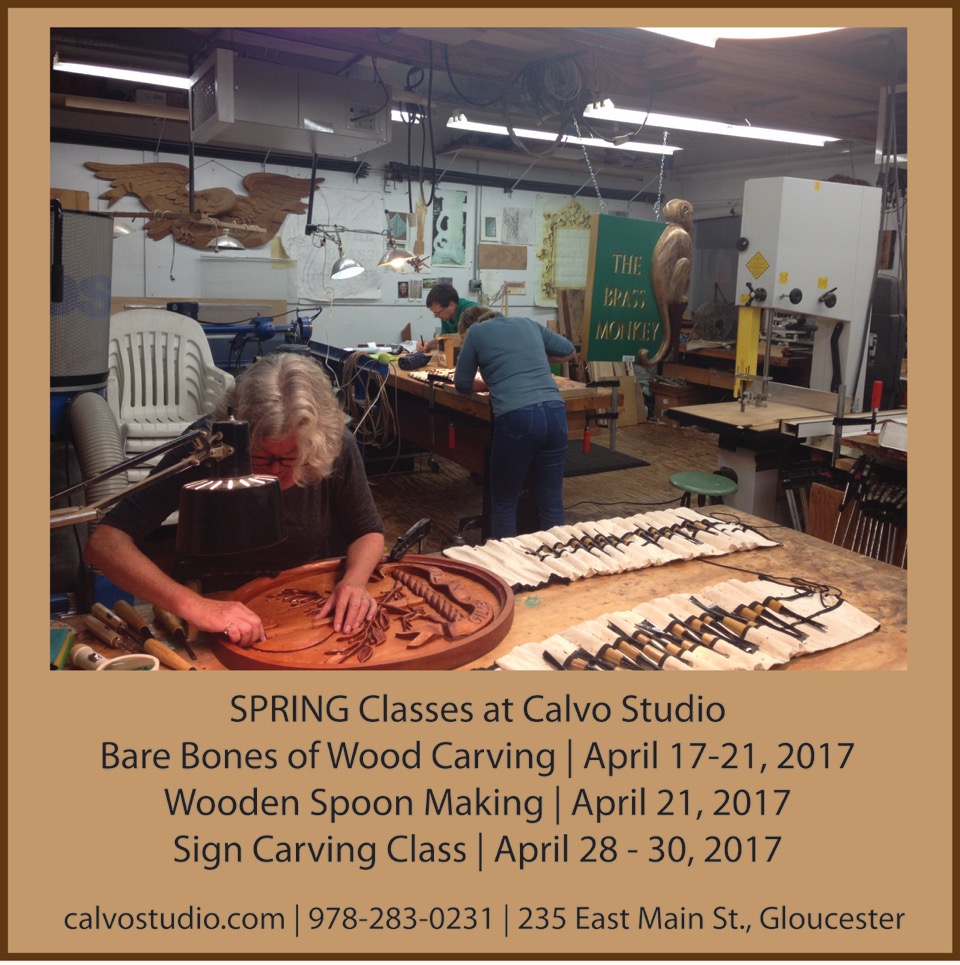 Master woodcarver David Calvo shares his work in progress, this exquisite sign he is creating for Gloucester’s newest gift and antique emporium, The Brass Monkey, located on Main Street in the old Pallazola building. For more information about Calvo Studios and David’s woodworking classes, visit his website here.