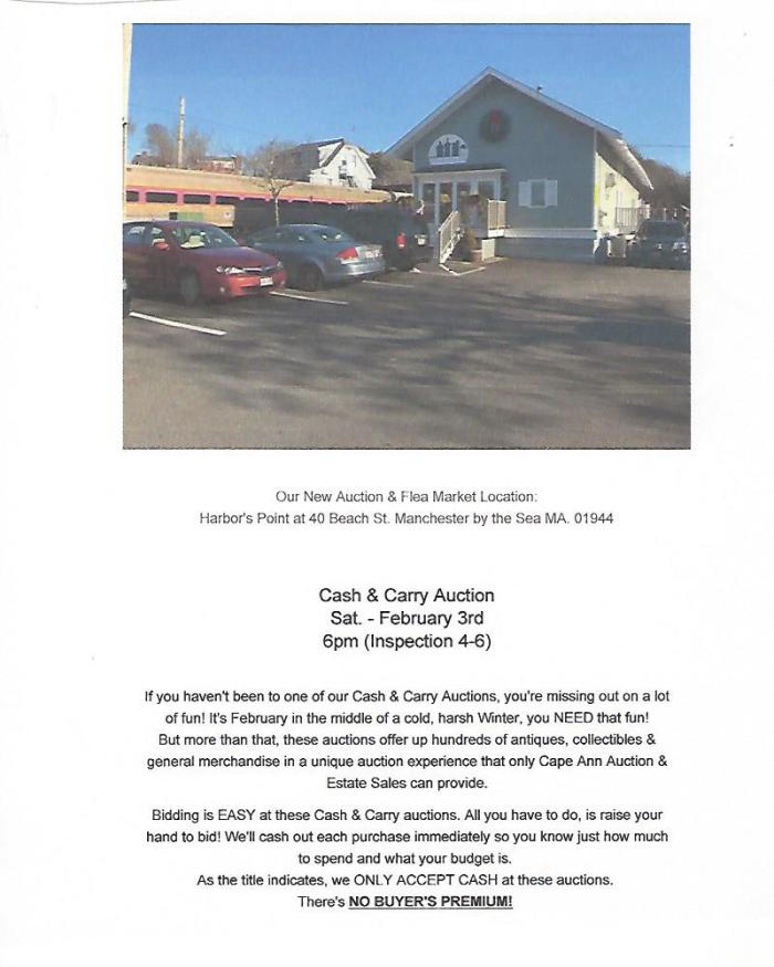 Updates, Pictures & details at: www.capeannauction.com – 978-395-7077 – MA Lic. #119