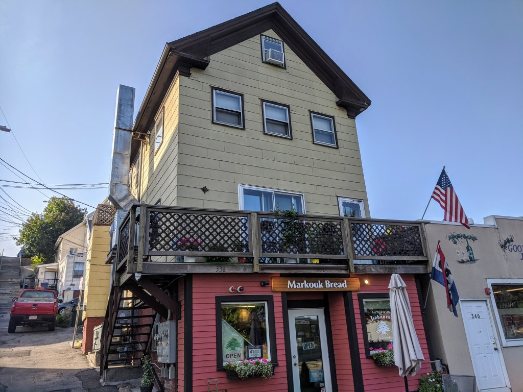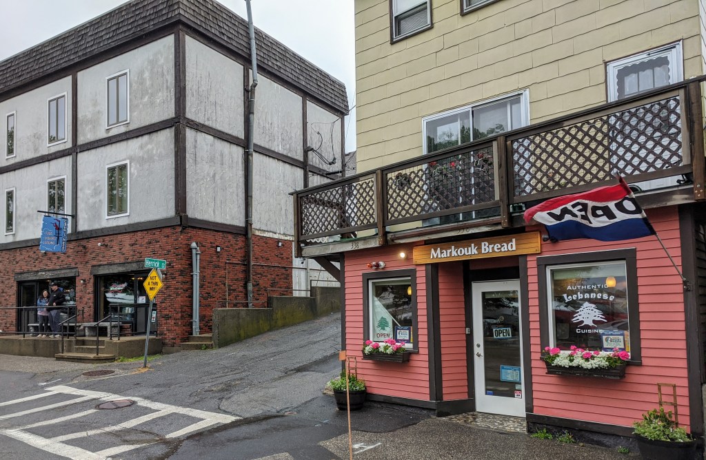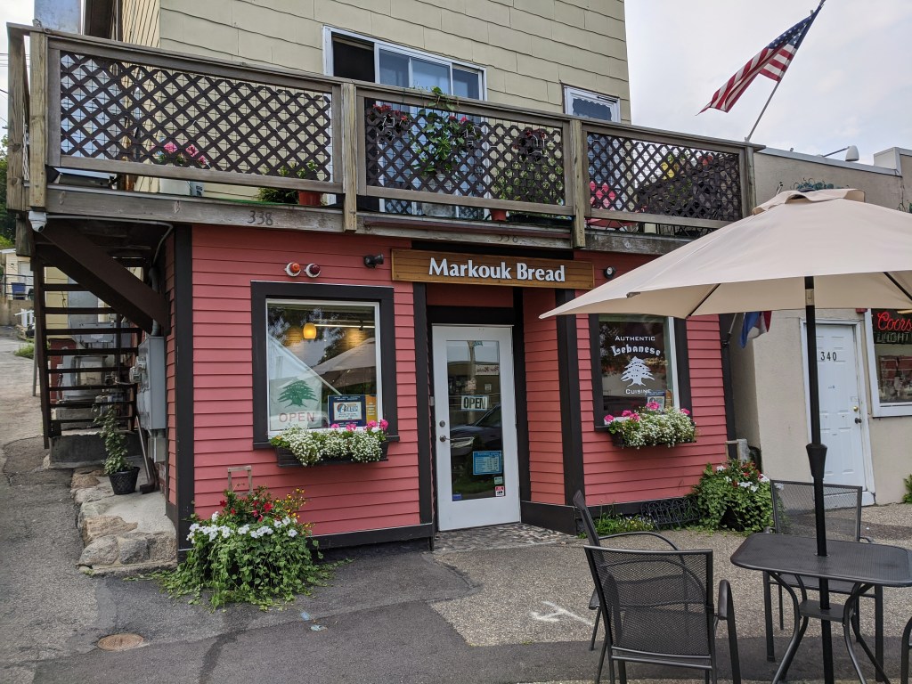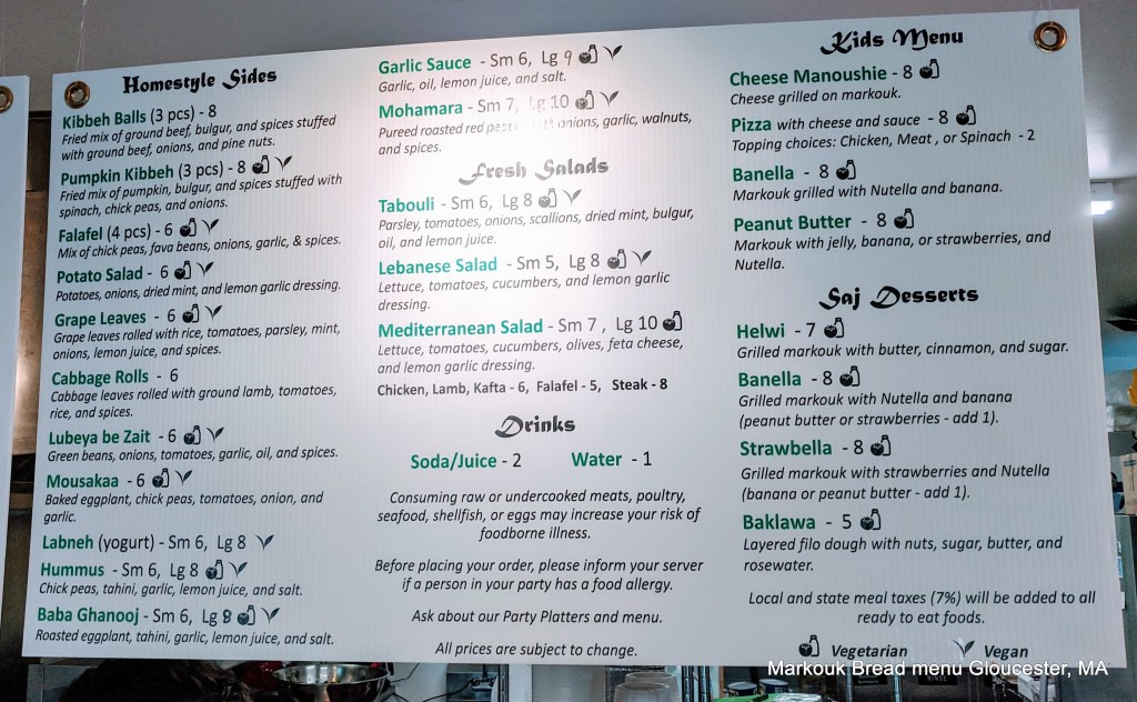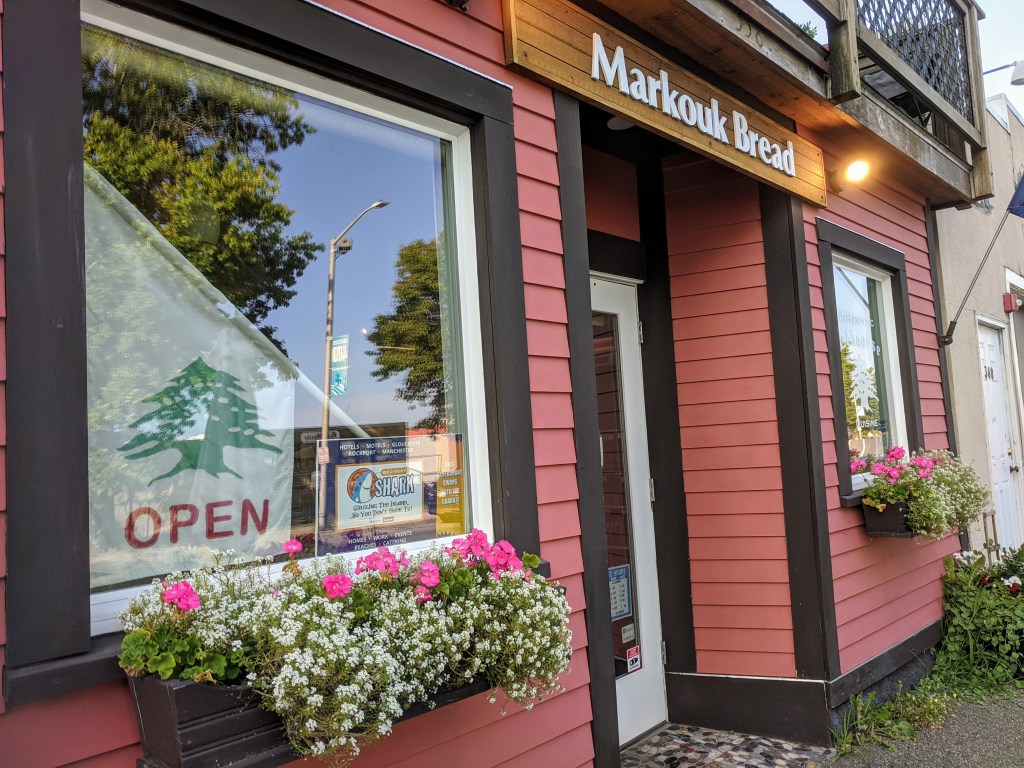 Maha Jabba, owner and chef at Markouk Bread, and crew create flavorful and delicious Mediterranean everyday eats at their location on 338 Main Street, in Gloucester, MA, near houses that inspired artist Edward Hopper, and famed public stairs and Crow’s Nest featured in books, art and cinema. Their popular and traditional dishes highlight Lebanese cuisine. Customers can eat standing or sitting–inside and out; most people opt for grab & go. Customers may find it helpful to call ahead (they sell out), and find it easier parking across the street.