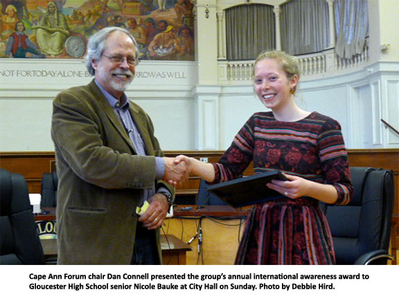 This is the Cape Ann Forum’s last major event of the 2017/2018 season, as the organization closes in its 100th presentation since it was formed in 2001, which will be commemorated next September. The May 6 forum will also feature the announcement of the organization’s annual international awareness award to a graduating Gloucester High School senior, which comes with a $500 scholarship.