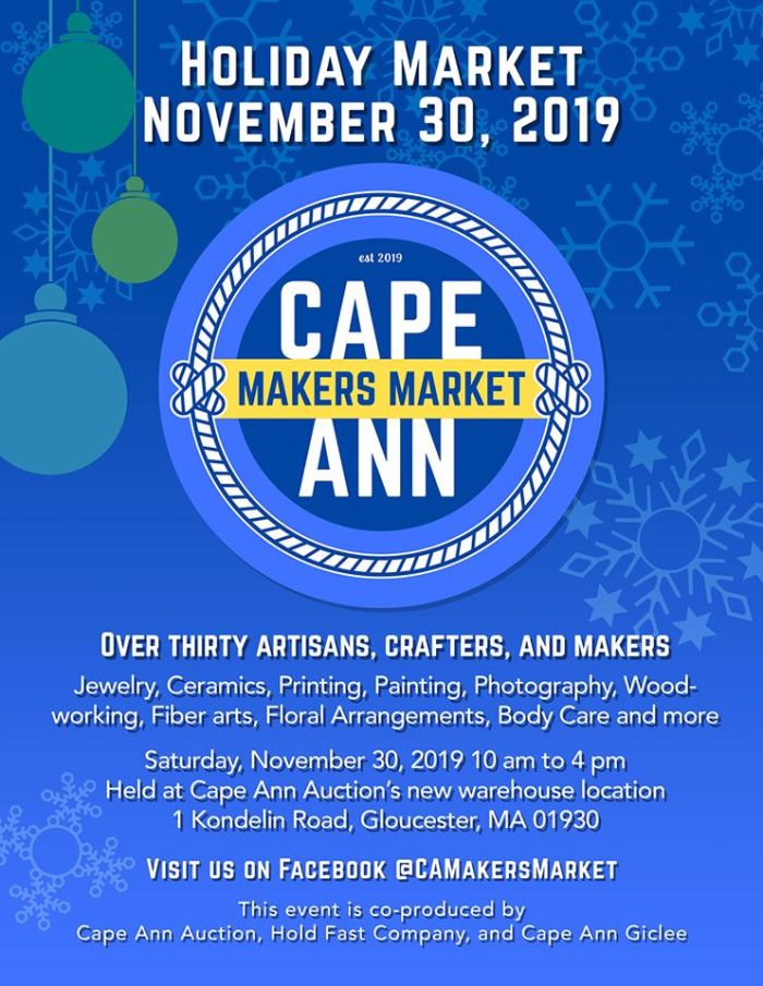 We are excited to offer for the first time, Cape Ann Makers Market, 2019 Holiday Market, an indoor holiday shopping event featuring artisans, crafters, and makers of Cape Ann and beyond. This event is co-produced by Cape Ann Auction, Hold Fast Company, and Cape Ann Giclee.