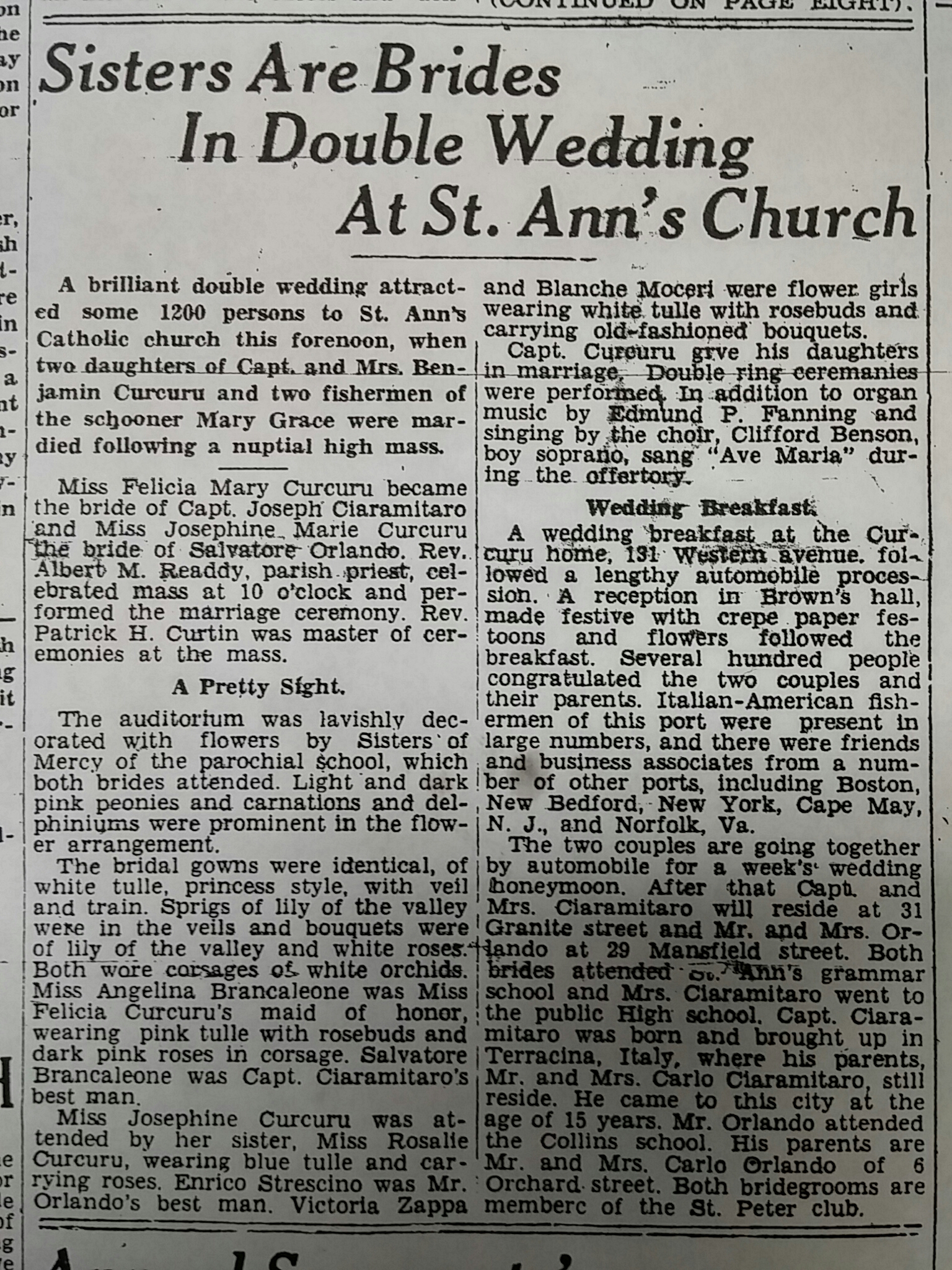 In 1938, all the up and coming leaders of the Italian community fishing fleet were listed as principals in this wedding. They were the future players about to write Gloucester fishing history. The Curcuru’s, Ciaramitaro’s, Branceleone’s, Strescino’s, D’Amico’s, Calamo’s, Novello’s, Orlando’s, to name a few, were all in attendance. It was a wedding spectacular!