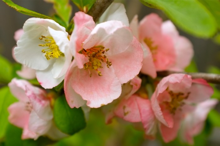 Shortly before it began raining this afternoon, my husband called me to the garden to have a look see. Three male Ruby-throated Hummingbirds were zinging about, drinking nectar from the flowers and fearlessly whizzing by each other in territorial displays. The tiny boys were mostly interested in our beautiful old Japanese flowering quince ‘Toyo-nishiki’ (Chaenomoles speciosa). They were also investigating the flowering pear tree and almost-ready to bloom crabapples, but not nearly as much so as the quince.