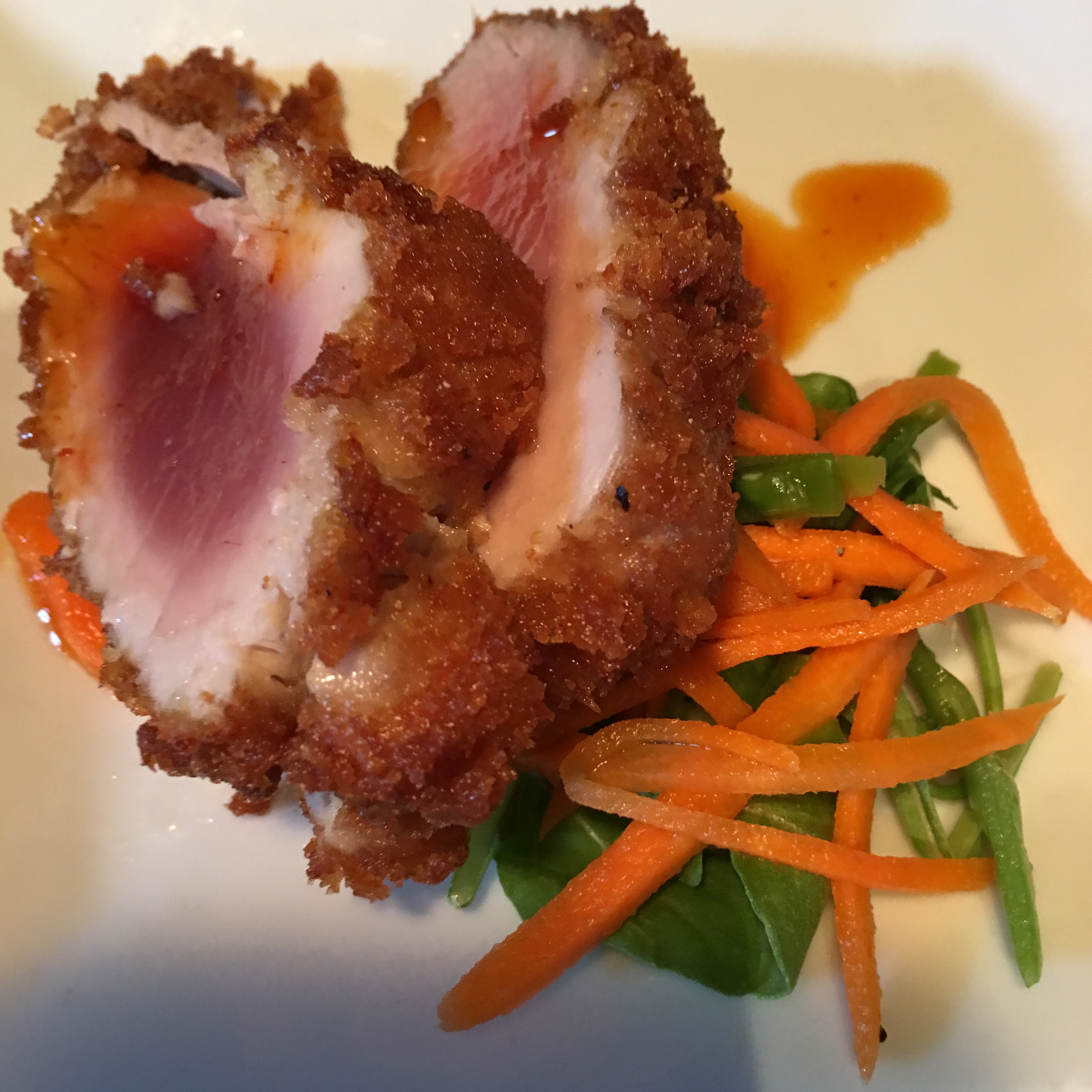 1st Course ~ Superb panko crusted super fresh big eye tuna, crispy rare, with sweet and spicy sriracha glaze, and carrot snow pea slaw. My husband says it is his new favorite entree, anywhere, anytime. Served with sparkling Brut Dargent Blanc de Blanc