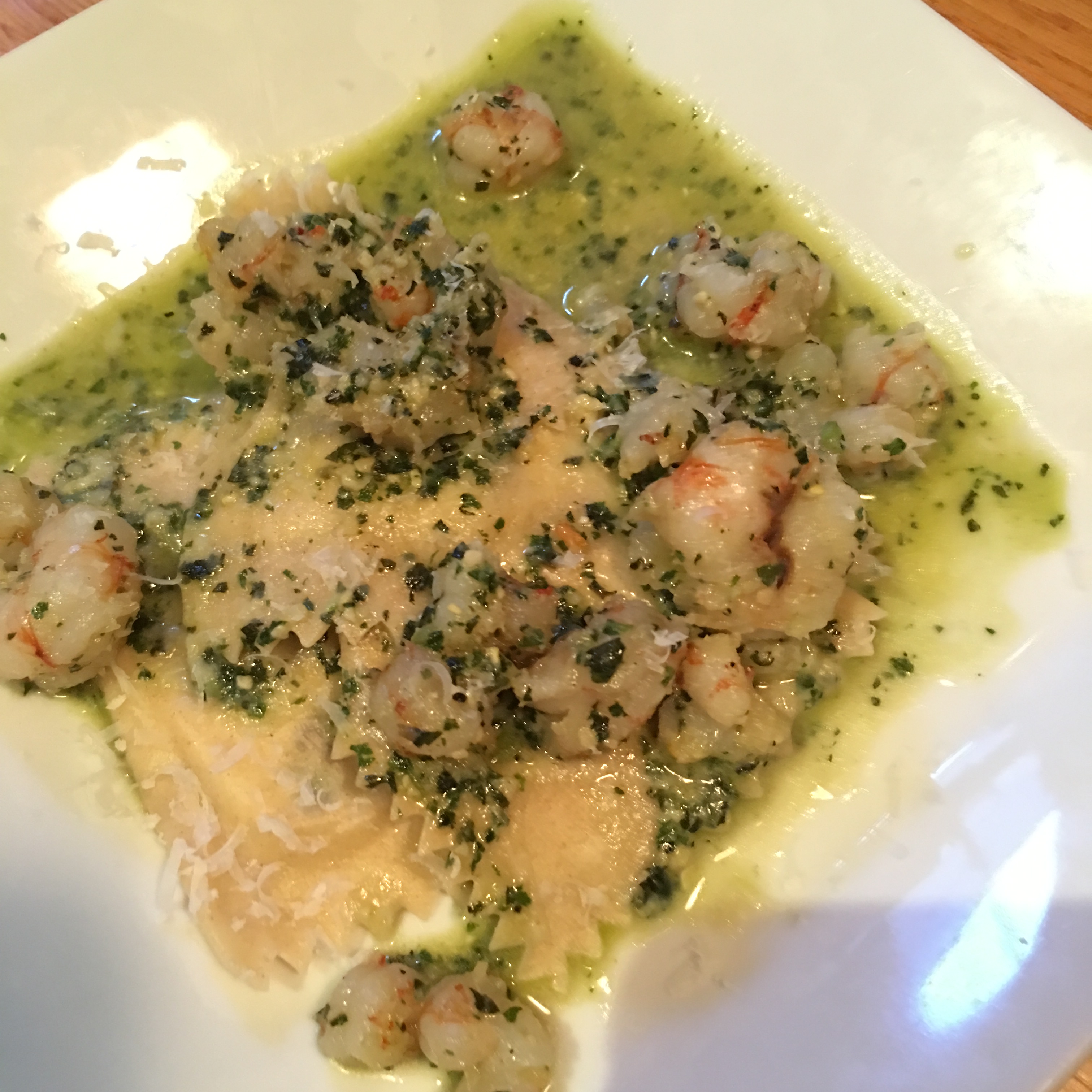 Rock shrimp in basil pesto with Danielle’s Pastaio escarole, radicchio, and cheese ravioli. U-n-b-e-l-i-e-v-a-b-l-e! With Jean and Paul Benoit Droin Chablis.