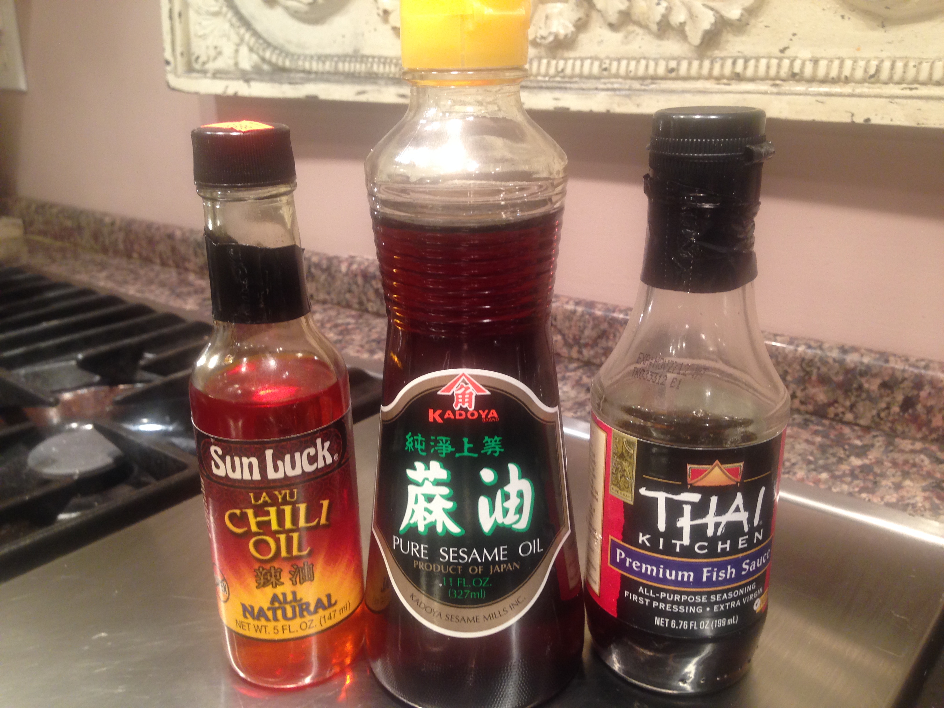 3 combine 3 tablespoons chili oil and sesame oil in large fry pan; heat over high setting
