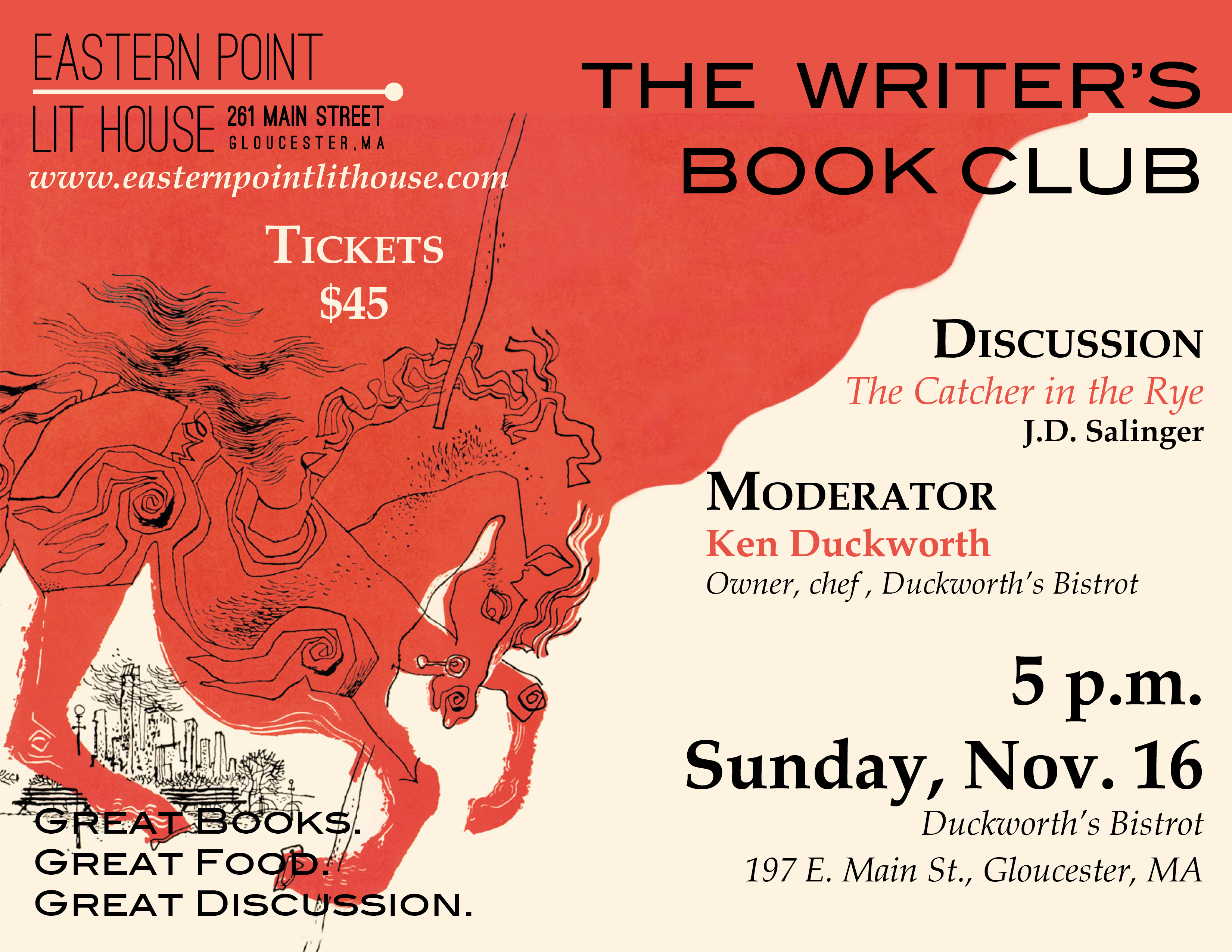 Ken Duckworth moderated a packed house at The Eastern Point Lit House Writer’s Book Club event, held at Duckworth’s on Sunday evening. Ken did a superb job both leading the lively and interesting discussion about Catcher in the Rye, and preparing a beautiful and delightfully delicious dinner for the attendees.