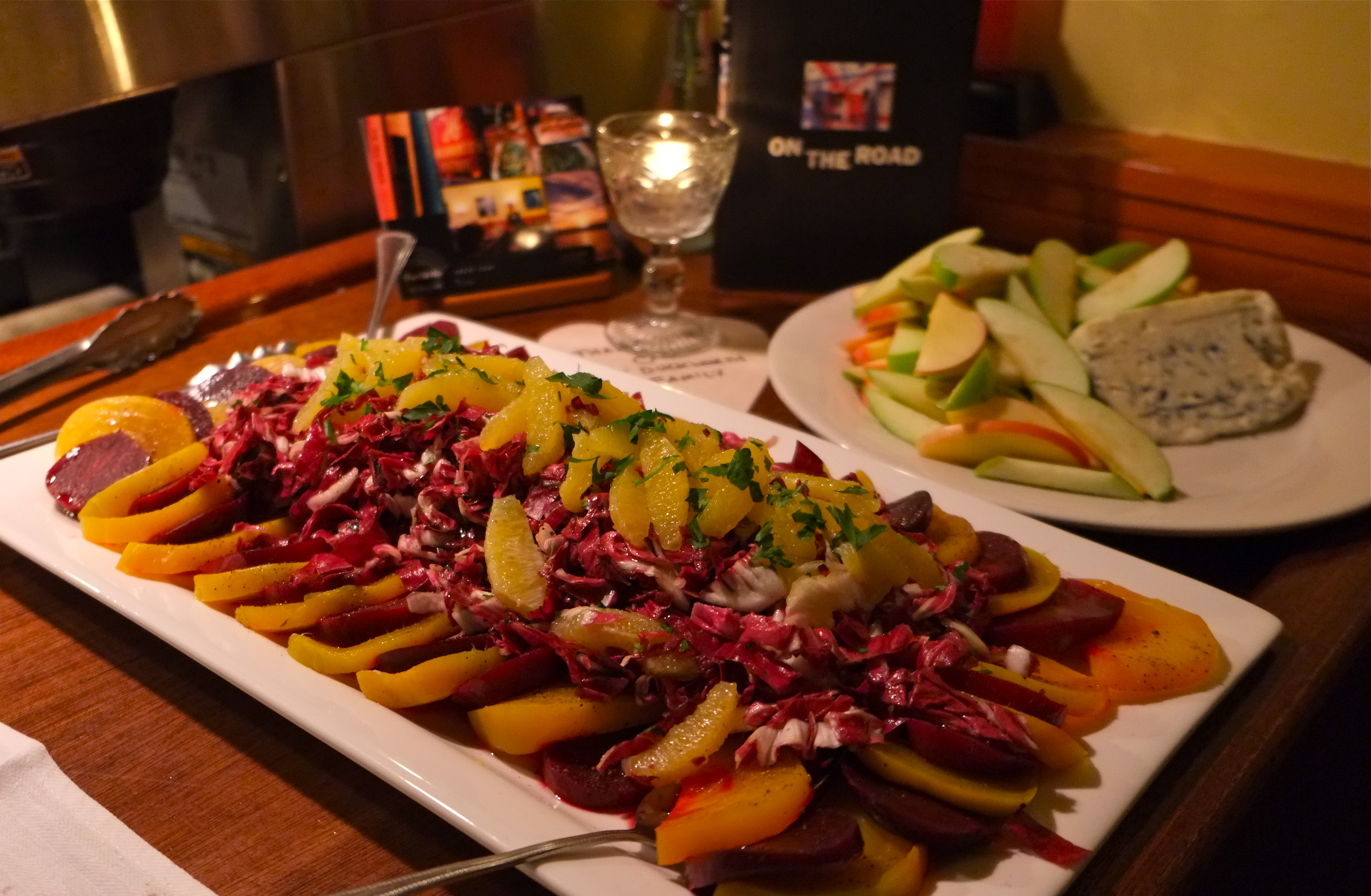 An array of salads, vegetable dishes, and soup accompanies every dinner.