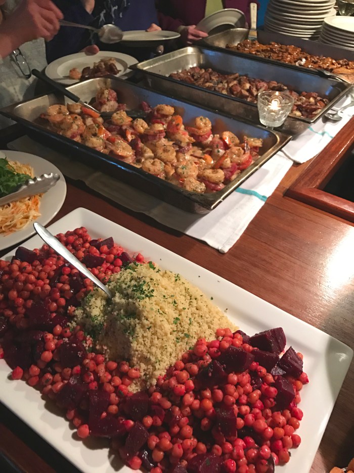 The evening began with a beautiful array of delicious dishes, including shrimp with guacamole, Ken’s always fabulous polenta, and a medley of lightly cooked and dressed seasonal vegetables.