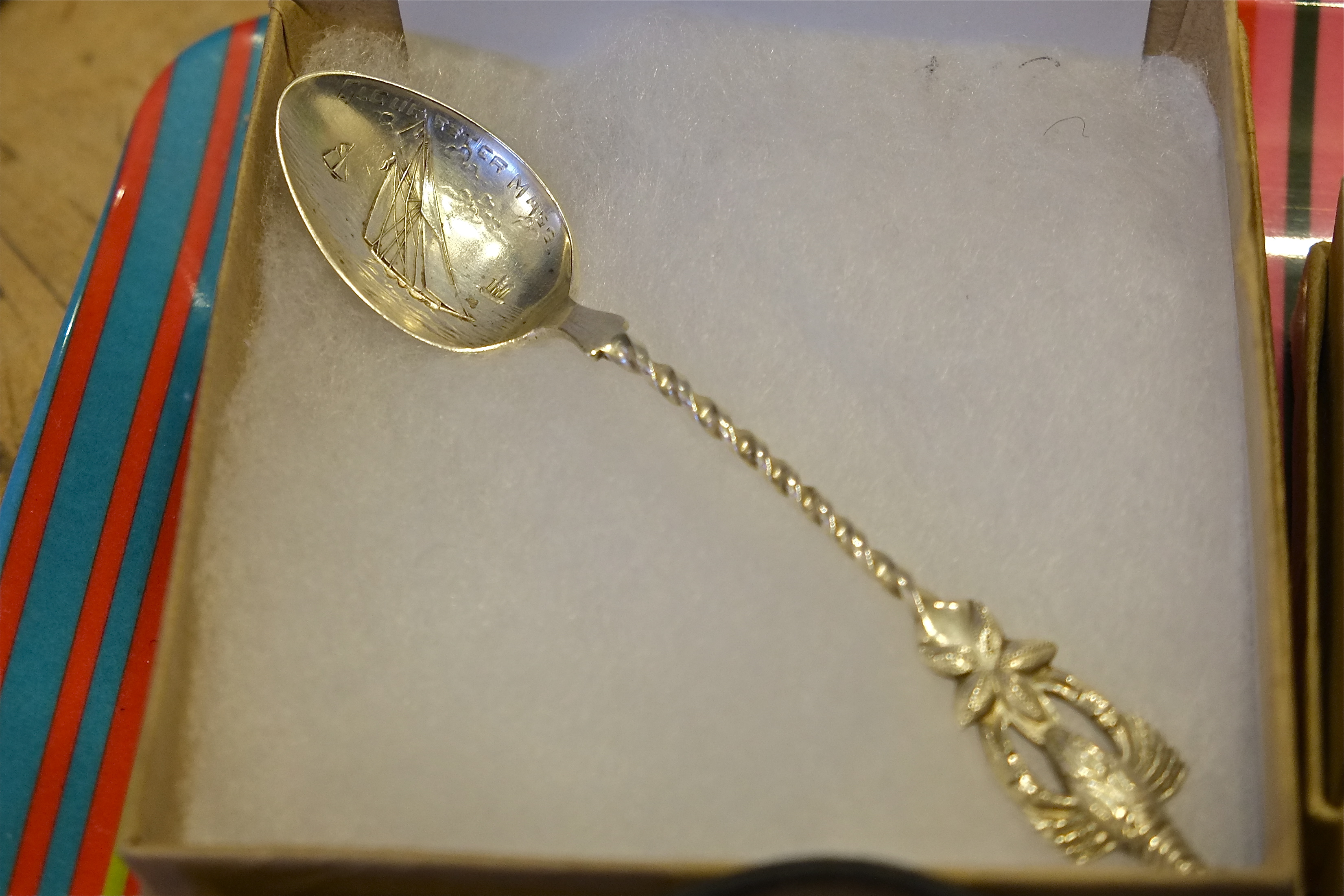This very unusual sterling silver spoon is etched with schooners and the words Gloucester Mass. The handle has both a lobster and starfish.