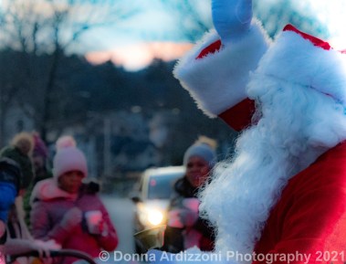 Images: Have you seen…? The blue crescent moon rising over Rt. 128 between the rotaries is the OG hanging lights design–an annual beacon heralding the Seasons that’s inspired others; the magical lights reflecting Goose Cove; ‘Merry’ on Cherry hedge; Days pond’s tiny floating Santa; Santa and his reindeer flying in the sky (seen from Rt. 128)