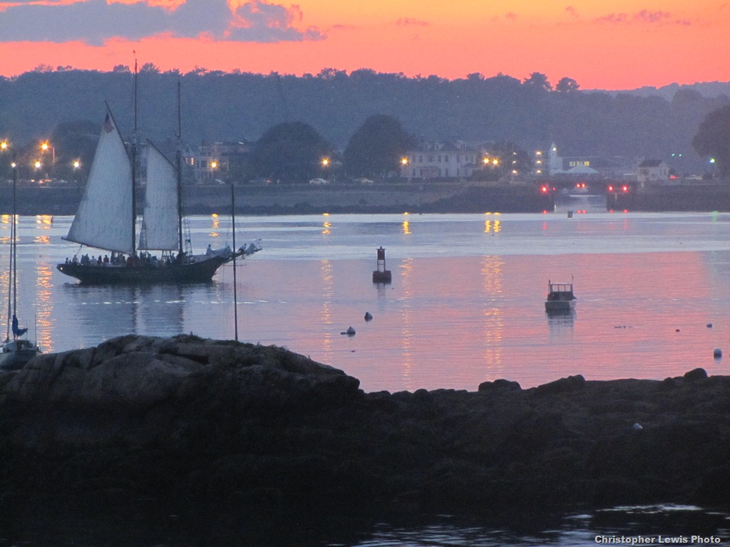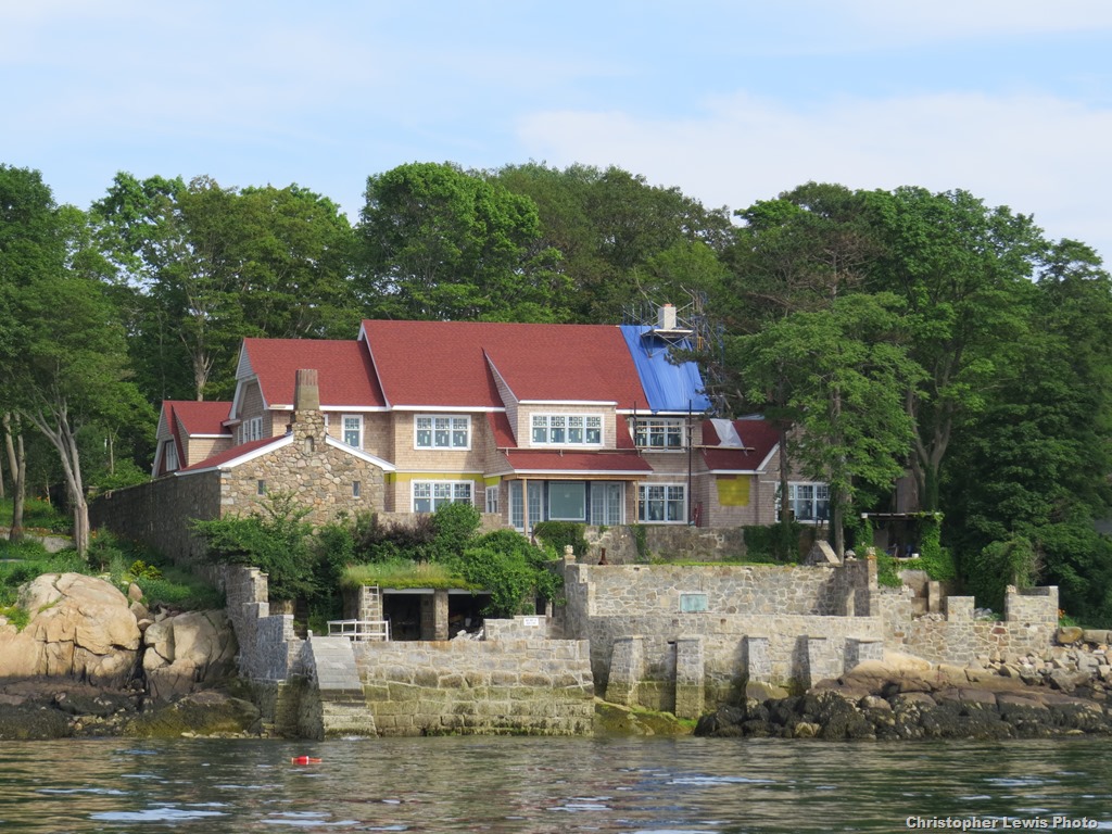 Two photos attached. The first is "Red Roof" on Eastern Point taken from the "Ardelle in 2012." This was the home of A. Piatt Andrew – for whom the Route 128 bridge is named. He was an under secretary of the Treasury. Red Roof was demolished on December 14, 2012. The second photo is of "Red Roof Redux," the new house, taken from the "Thomas Lannon" on Sunday. The wing to the left and the stone work in front of the house were retained.