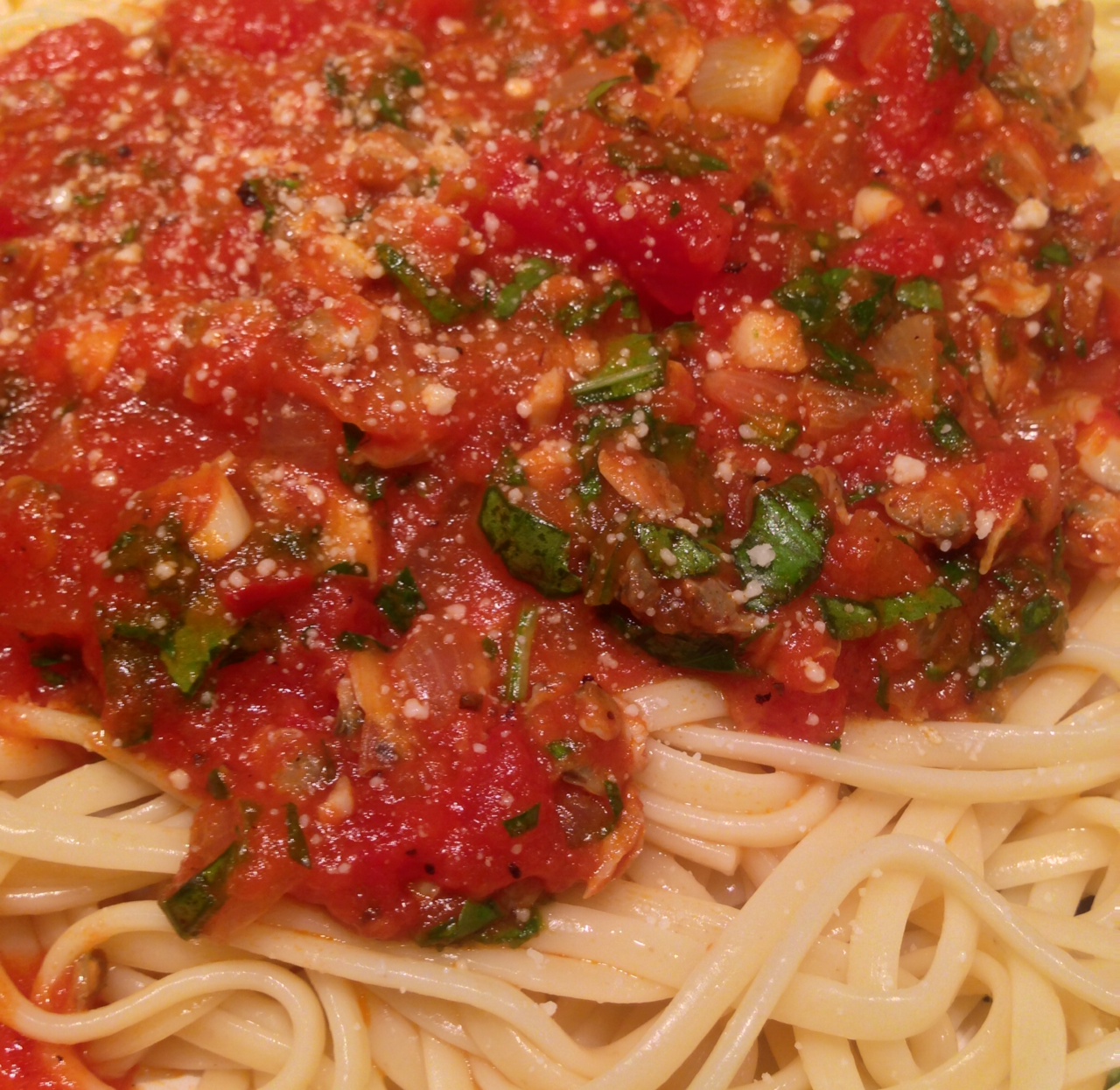 7 Plate pasta in serving bowl; ladle hot sauce over pasta; top with Parmesan cheese