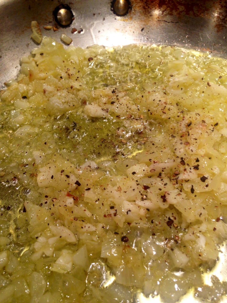 1 Heat olive oil in large frying pan over high heat; add garlic, onions, ½ teaspoon kosher salt and ¼ teaspoon freshly ground pepper; saute 2-3 minutes until onions are translucent