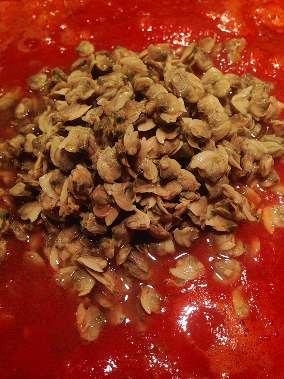 3 Add diced tomatoes, whole baby clams and their juices; mix well; add red pepper flakes ¼ teaspoon freshly ground pepper and white wine; cook 20 minutes; stir often