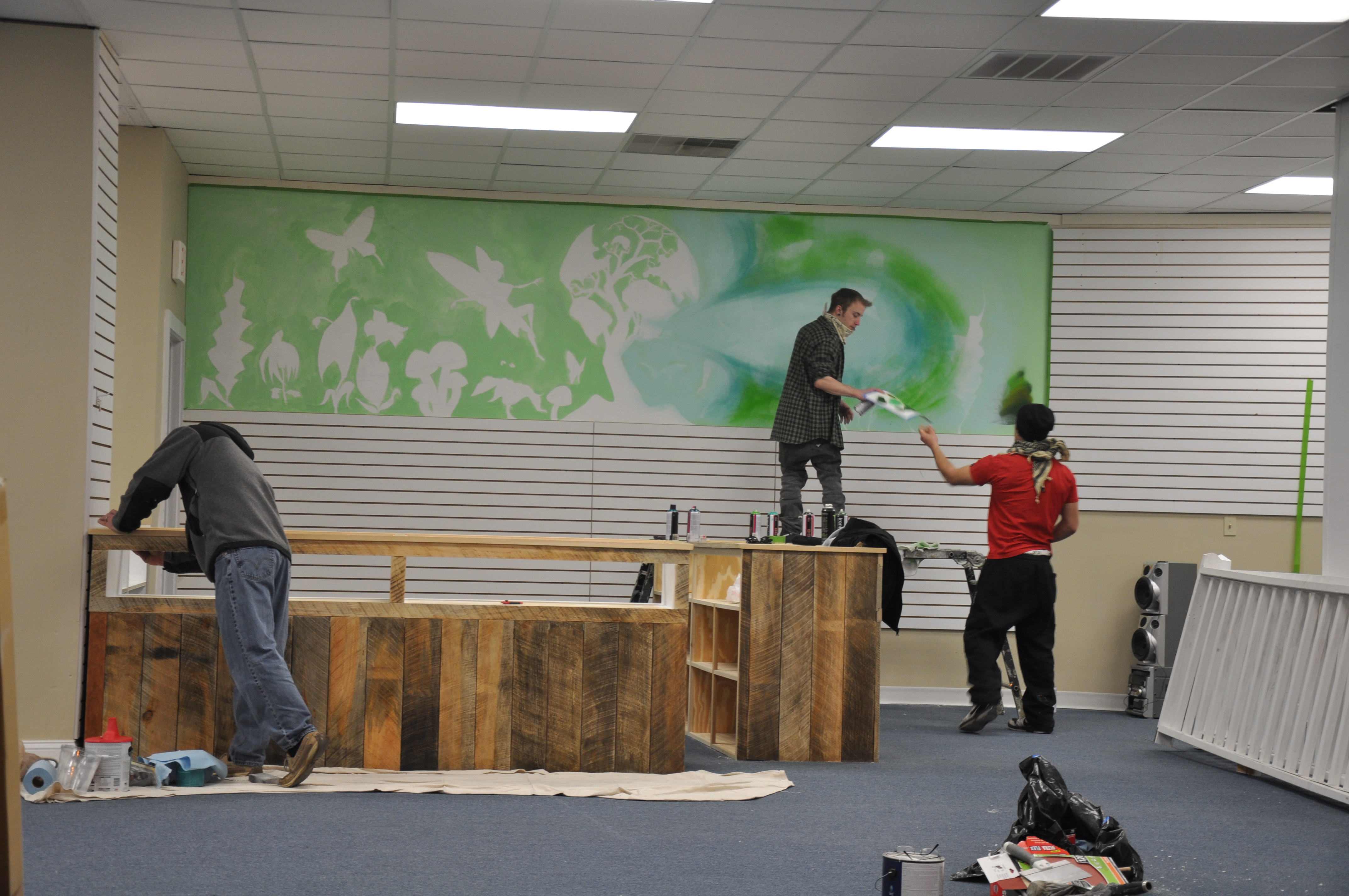 As you hopefully saw last week, Cole Herbst is doing a beautiful new mural in the Main Street space that the Eco Boutique is moving into. Below is an interview with the artist (interviewed by Jason Burroughs) – the store is stocked now, so go in and check it out in the Brown’s Mall building!