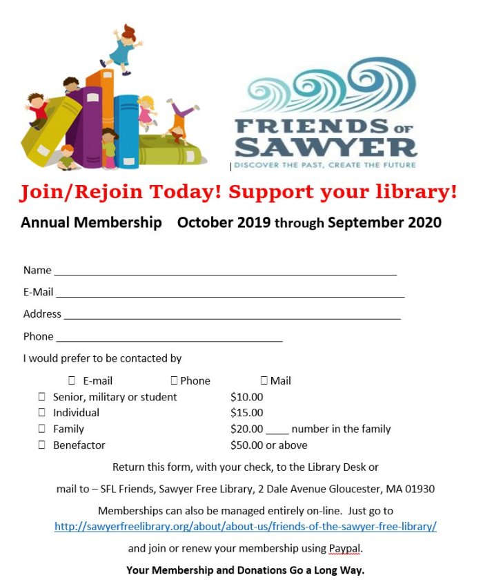 “Please join or renew to help the Friends of Sawyer Free support the programs that take place in the library!”