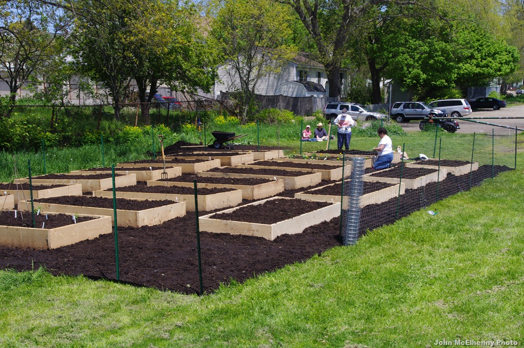 The plantings are in the ground at the Burnham’s Field community garden! On Saturday, the gardeners finished building the 20 raised beds, put up a fence to keep pets out, and began the really fun part: growing vegetables and flowers to harvest in the months to come. A small sample of “crops” being planted includes bell peppers, zinnias, carrots, strawberries, lavender, watermelons and marigolds. Thanks very much to the Gloucester DPW for delivering two trucks full of donated compost.