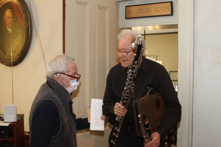Donor Phil Cutter chatting with Stephen Bates, who played the clarinet and flute