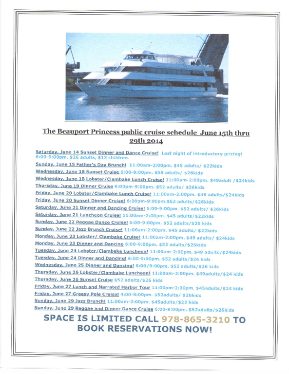 Beauport Princess Public Cruise Schedule June 15th-29th 2014