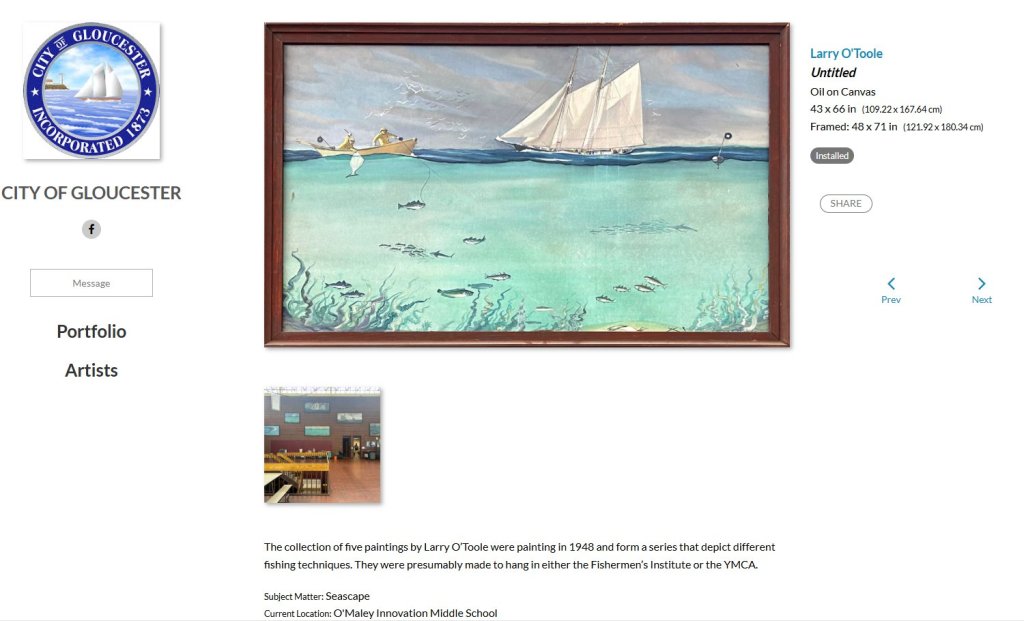 Committee for the Arts member, Eric Schoonover, took on the task of the first database and digitized record–CDs, later joined by Marcia Hart, with ladder in tow to double check the inventory status and measurements which was not on the 2006 report. Several excels and docs followed and were shared widely. Under successive administrations led by Mayor Kirk and Mayor Romeo Theken, an open access inventory and available online gallery was an expressed goal for multiple city and partner grants, the city’s tourism efforts (a precursor to Discover Gloucester), the City’s two cultural districts, HarborWalk, Gloucester Arts & Cultural Initiative, public arts projects, free apps and platforms.