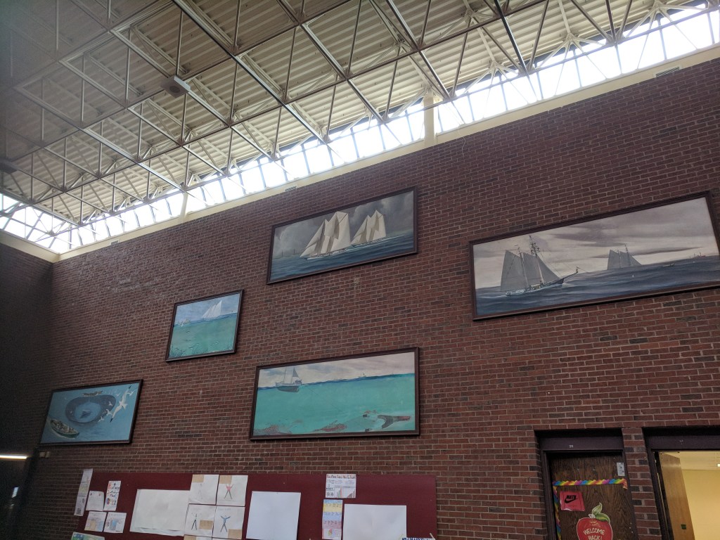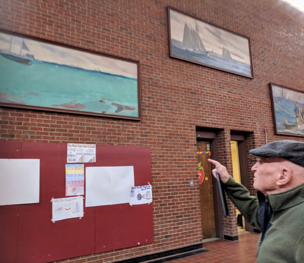 For example, the monumental murals by Lawrence “Larry” O’Toole (1909-1951) installed in 1982 in O’Maley Middle School are listed “Untitled” in the archive pages. They’re not untitled. They were originally commissioned by Ben Pine for the Gloucester Fisheries Institute and YMCA circa 1940-48 and illustrate fishing industry and vessels common in Gloucester. I interviewed Ron Gilson who confirmed the history and my research. DPW inspected and measured them almost 10 years ago and Williamstown Art Conservation Center, of course, when they did their evaluation. Titles are: