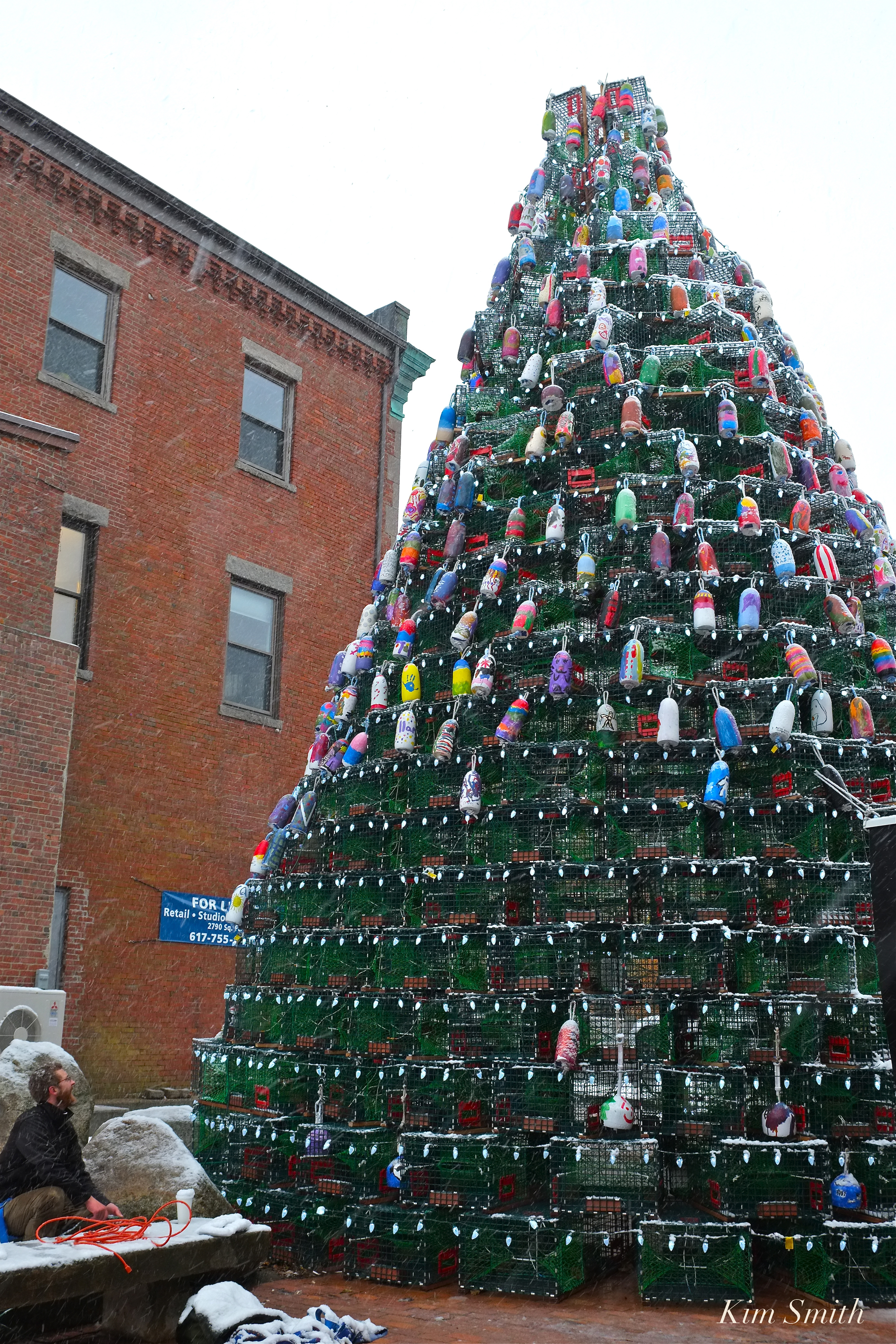 By noon today the super dedicated Lobster Trap Tree building team had made great headway. With snow predicted for tomorrow, the crew plans to have the tree built by day’s end. Don’t let the photos deceive; Shawn Henry was wearing shorts but it was frigid at noon and only getting colder as the day progressed.