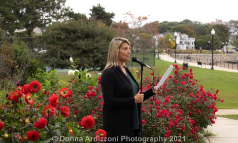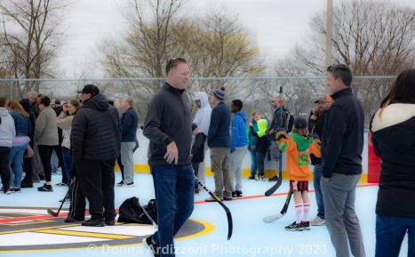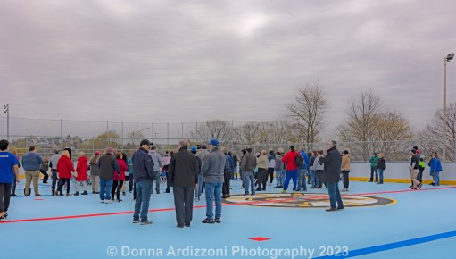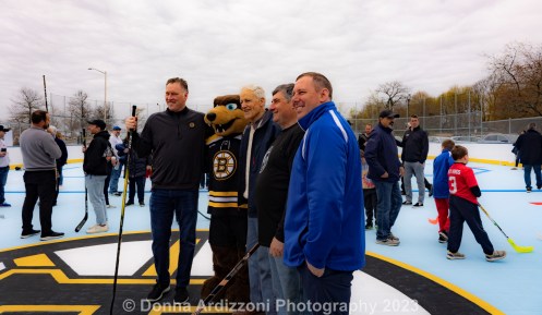 Great turn out for the dedication of the Street Hockey Rink at Stage Fort Park.  A big thank you goes out to all the committee member, volunteers, the city of Gloucester, The Boston Bruins and the generous donations of the citizens of Gloucester.  It looks so pretty and fun.  Ken Knowles, Rockport artist, did an amazing job on the center ice Bruins’ Logo.