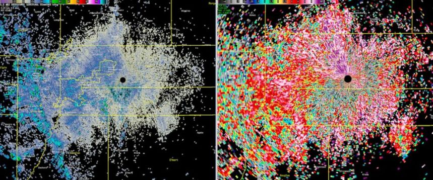 Paul Schlatter of the National Weather Service said he first thought flocks of birds were making the pattern he saw on the radar Tuesday, but the cloud was headed northwest with the wind, and migrating birds would be southbound in October.