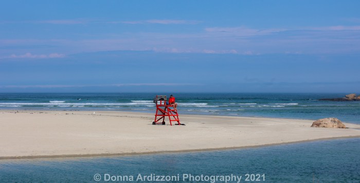 This lifeguard is waiting for the beachgoers on a beautiful day.