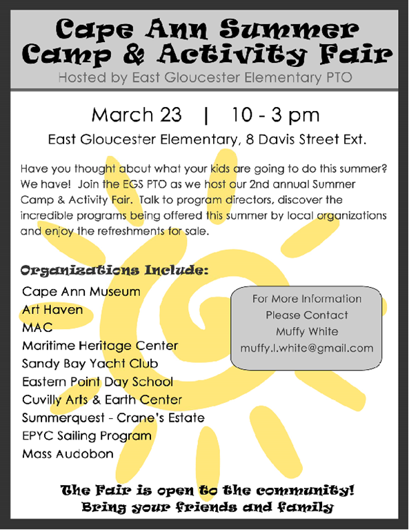 East Gloucester Elementary is having a Summer Camp and Summer Program Fair.
