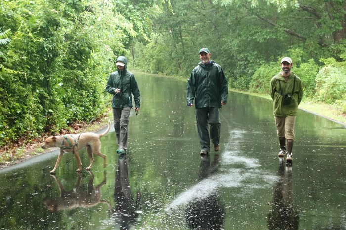 My response to Catherine’s call for a single photo of the impact of the rainy summer on us. Here are one daughter and two sons-in-law (with dog) taking a walk during Hurricane Elsa, during a family visit.