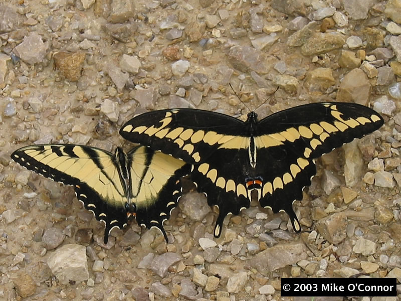 Giant Swallowtail Butterflies, with a wingspan of up to 6.5 inches across, are noticeably larger than Eastern and Canadian Tiger Swallowtails (Eastern Tiger Swallowtail, left, Giant Swallowtail, right).