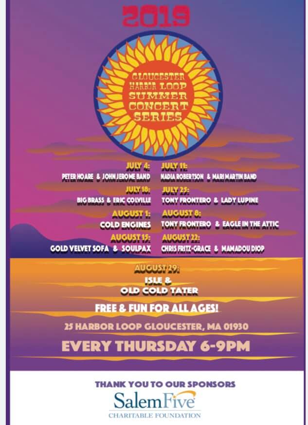 Special thanks to our main sponsor Salem Five Bank as well as to our community sponsors Cape Ann Lanes, Salt Water Grille & Pub, Sunbanque Tanning, Jerry Noble Electricians, Maplewood Car Wash & Pratty’s! We could NOT do this without you! And we hope all of you will visit our sponsors to give them your business and say thank you too! For helping bring the joy of music on hot summer nights to us all! See ya on the hill!