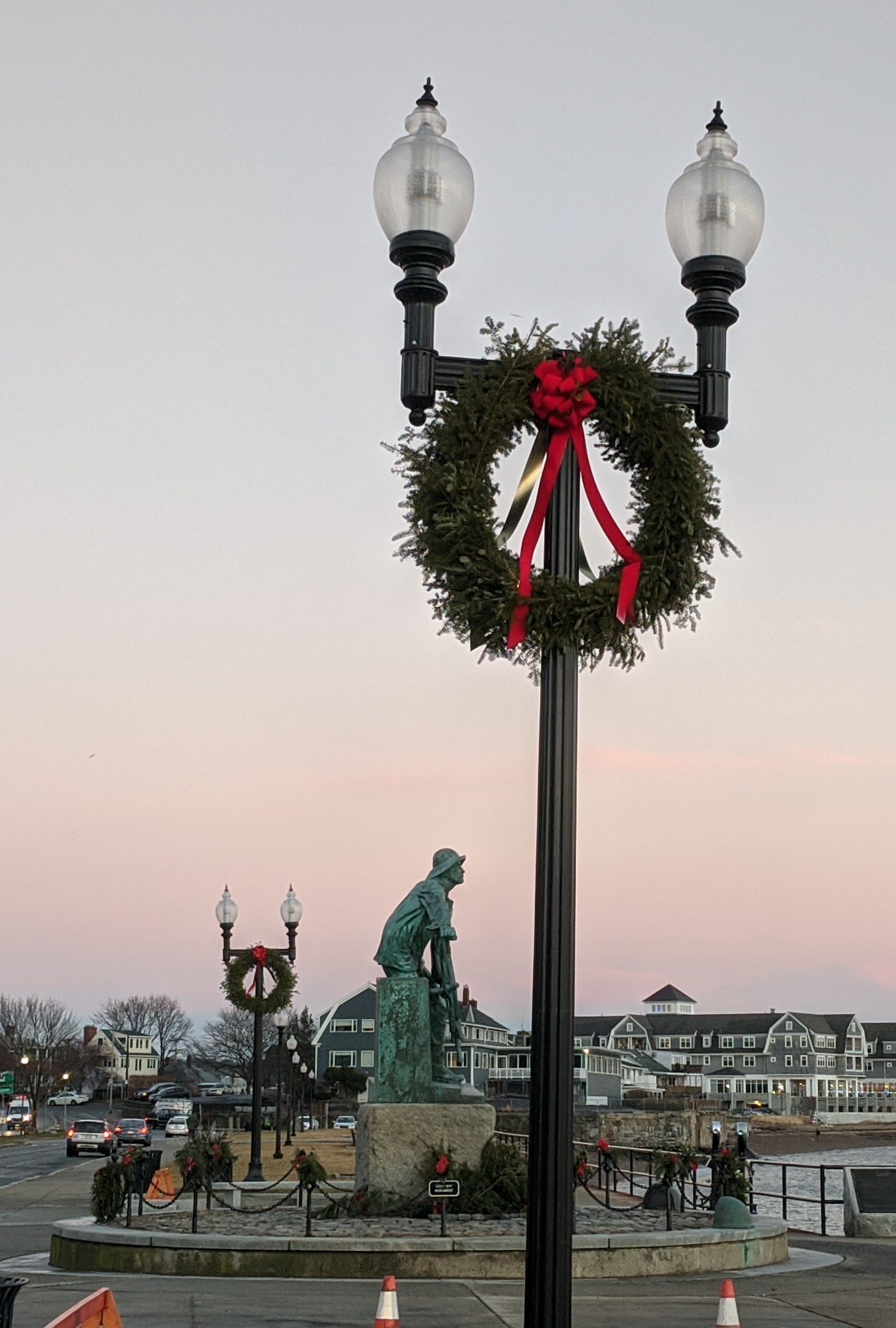 Digging out photos: A few after the winter storm scenes of downtown Gloucester by 9:30AM 12/18/2020. Any surface brick or stone is slick as can be. Evergreen pine trees & wreaths were randomly frosted like the Kancamagus Highway. Yet snow was already gone from the marsh.