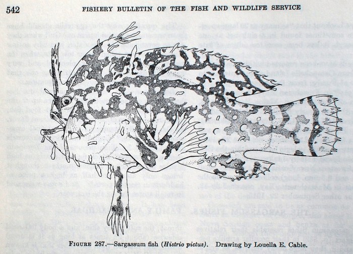 Occurrence in the Gulf of Maine— A specimen about 4¾ inches (12 cm.) long, that was picked up in a purse seine near the surface over the west central part of Georges Bank, by the Schooner OLD GLORY on September 15, 1930, and a second of 2¼ inches, taken off the southeast slope of Georges Bank, by the sword fisherman LEONORA C, on June 15, 1937, are the only records of this fish in the Gulf of Maine; the most northerly records, in fact, for it for continental waters in this side of the Atlantic. But it has been picked up from time to time near Woods Hole. Living, as they usually do, among floating gulf weed (Sargassum), it is not astonishing that sargassum fish should drift in over the offshore banks, occasionally.
